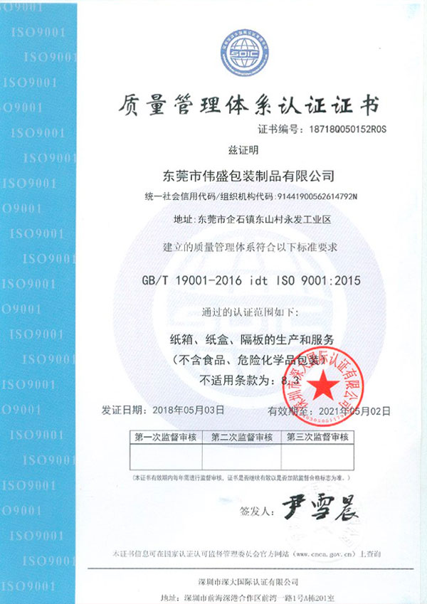 東莞市偉盛包裝制品有限公司成立于2010年,已通過ISO9001質(zhì)量體系和ISO14001環(huán)境體系認證,公司占地面積5000平方米,十幾年的發(fā)展,公司一直致力于紙箱、紙盒、啤盒、彩盒、飛機盒等紙制品,廣泛應(yīng)用于電子,家私、工藝品、燈飾、五金、塑膠等產(chǎn)品的包裝上,歡迎新老客戶致電垂詢。